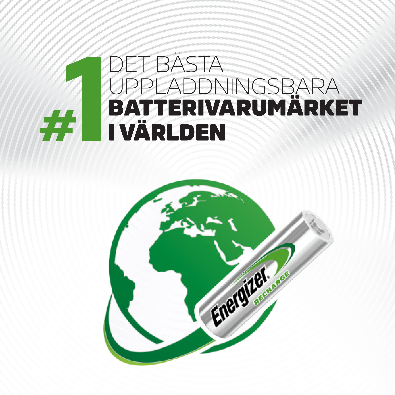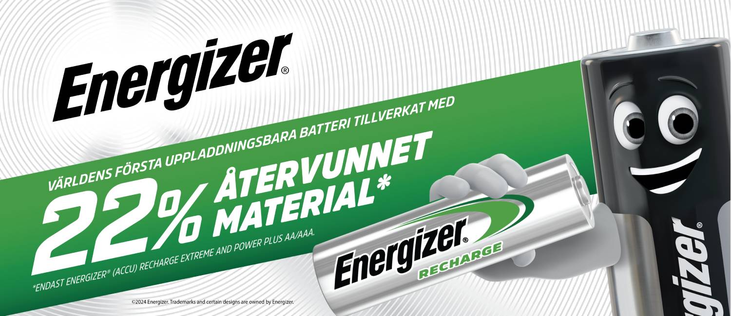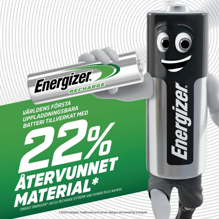 Miljöansvar möter inspirerande teknik – vi presenterar världens första uppladdningsbara AA/AAA batteri som tillverkats med 22 % återvunna batterier. Nu kan du spara pengar och minska din miljöpåverkan genom att minska antalet kasserade batterier och därmed skapa mindre avfall. Genom att använda Energizer Recharge® -batterier för energislukande enheter som digitalkameror, handhållna GPS-enheter, trådlösa spelsystem, leksaker och mycket mer – upplever du bekvämligheten och värdet med innovativ, branschledande laddningsbar batteriteknik.