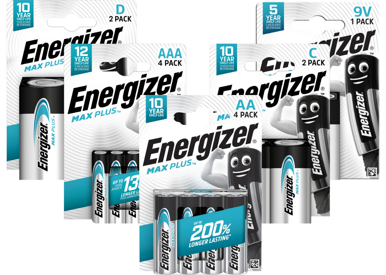 Wir stellen vor: unsere neue Linie leistungsstarker Alkaline-Batterien! Max Plus™ sind unsere langlebigsten AA- und AAA-Alkaline-Batterien, die Ihre Geräte mit starker Leistung versorgen! Außerdem behalten sie ihre Ladung bis zu 10 Jahre lang, damit Ihre Lieblingsgeräte jederzeit einsatzbereit sind.