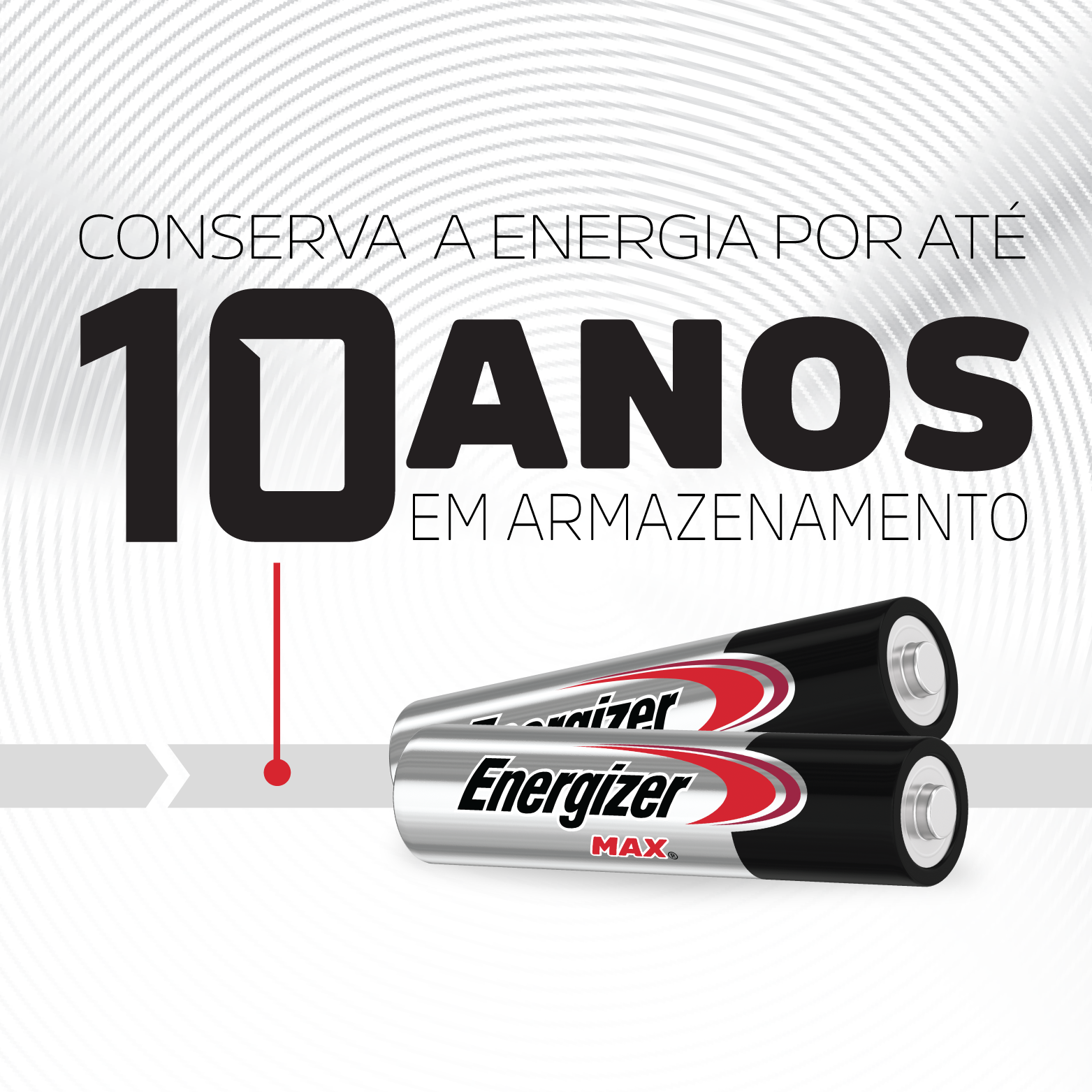• Validade: as pilhas alcalinas AA Energizer têm uma vida útil de até 10 anos, por isso estão sempre prontas quando você precisa delas.